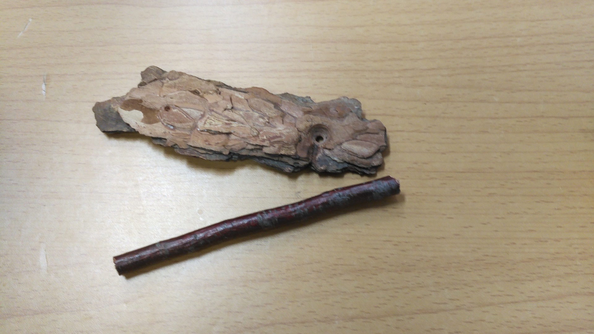 于是在我们几个人的疯狂折腾之下,一种新的钻木方法被我们发现了。只需要一个人拿一块有个小洞的小木板压住木棍,扶好底板,另一个人用绳子左右来回拉木棍(可惜图找不到了)。这样的话效率又提高了几倍,于是我们成功地钻出了浓烟...让整层都闻到的浓烟,但是还没钻出火。